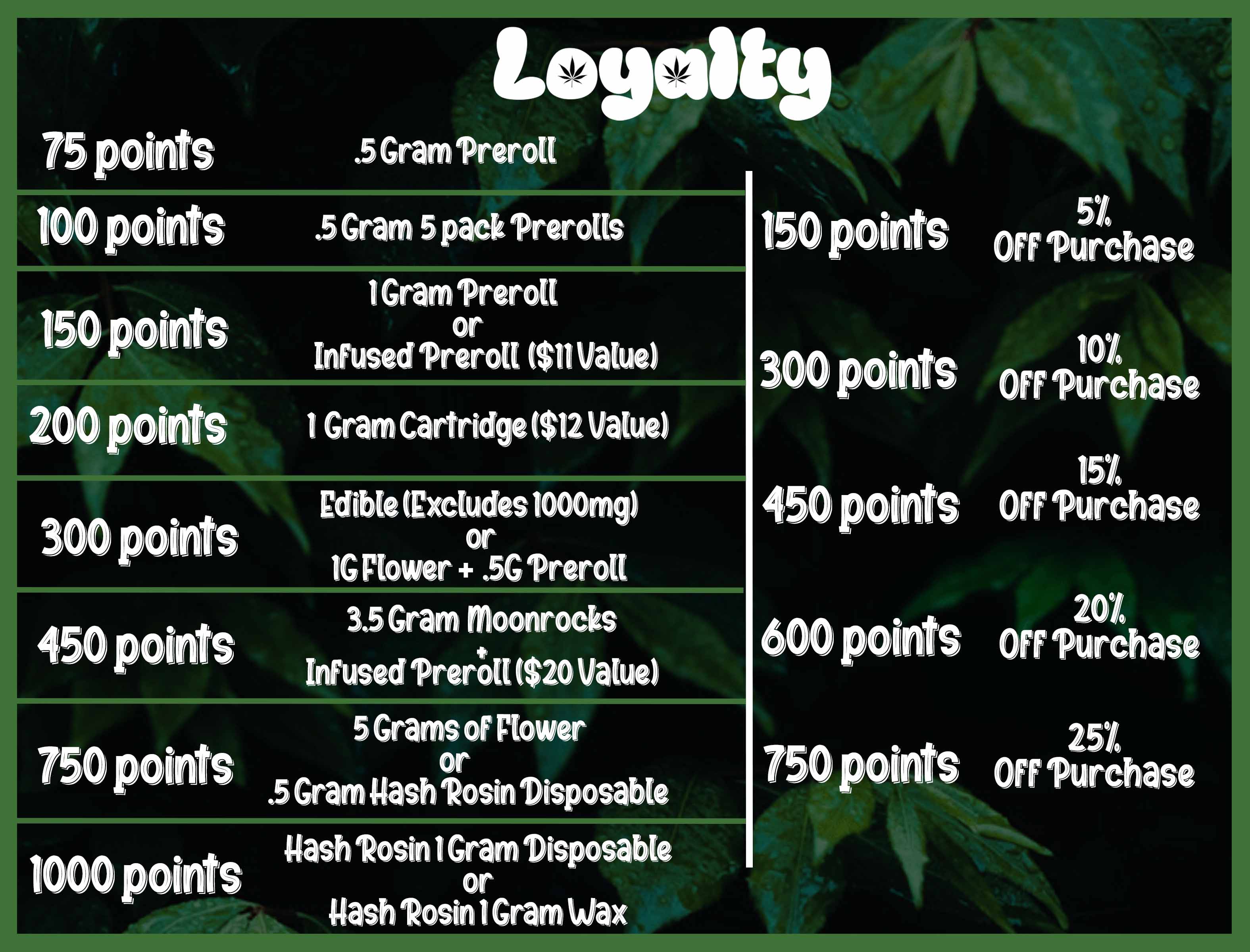 At 1912 Cannabis Company, we value your loyalty to cannabis. With every purchase, you'll earn valuable loyalty points that can be redeemed for discounts.